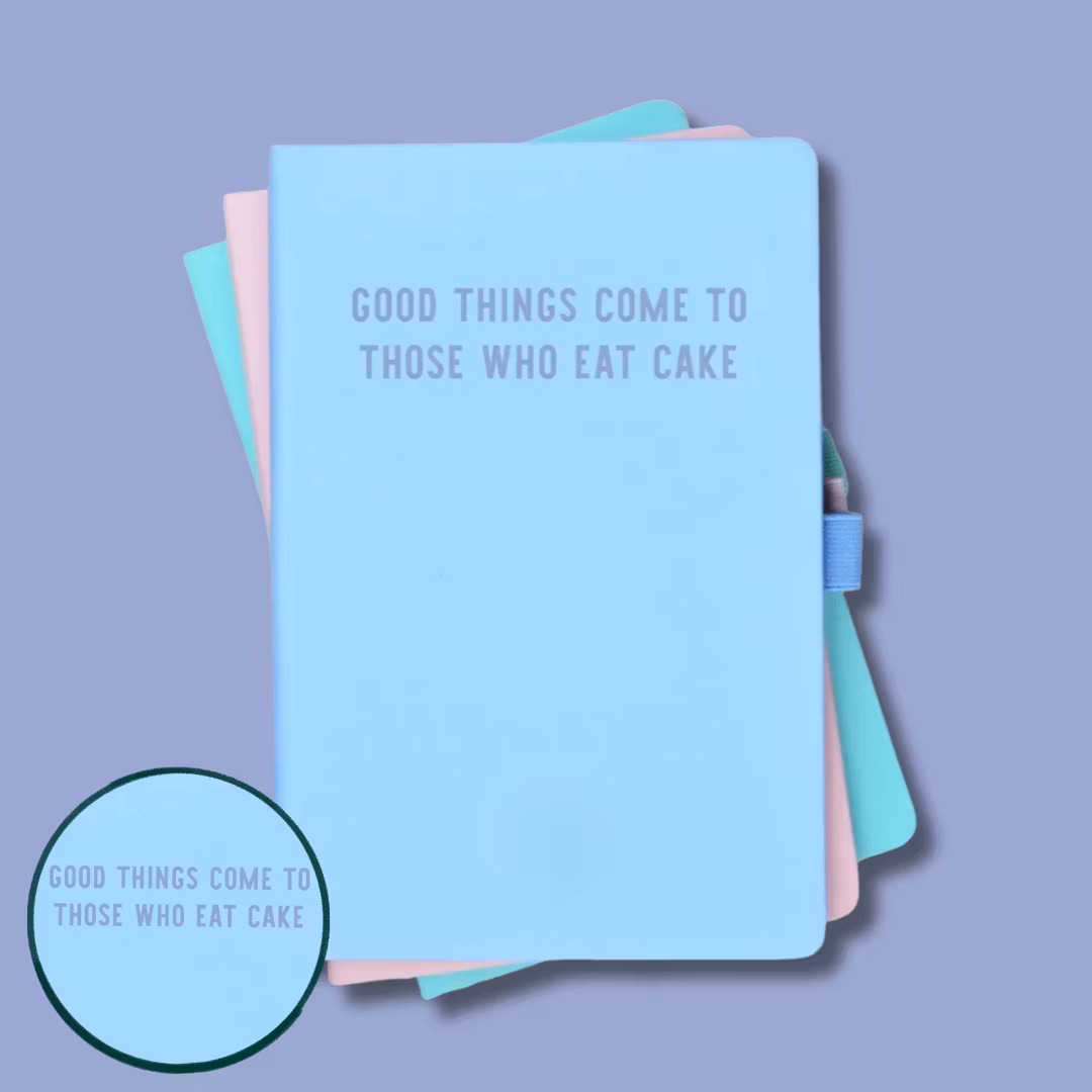 Good Things Come to Those Who Eat Cake – en pastellmjuk anteckningsbok i ljusblått som ser ut som vilken gullig dröm som helst.