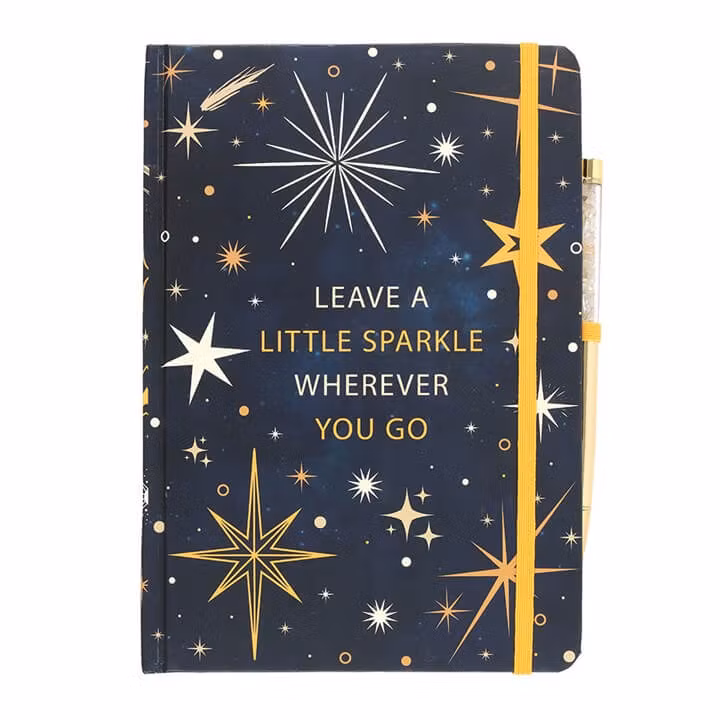 Ibland behöver vi en påminnelse om att vi bär på vår egen magi. Anteckningsboken "Sparkle" är precis den påminnelsen. Med sitt djupa, mörkblå omslag täckt av gnistrande stjärnor och det inspirerande budskapet "Leave a little sparkle wherever you go", blir den snabbt din mest trogna följeslagare för både vardagens listor och nattens stora visioner.