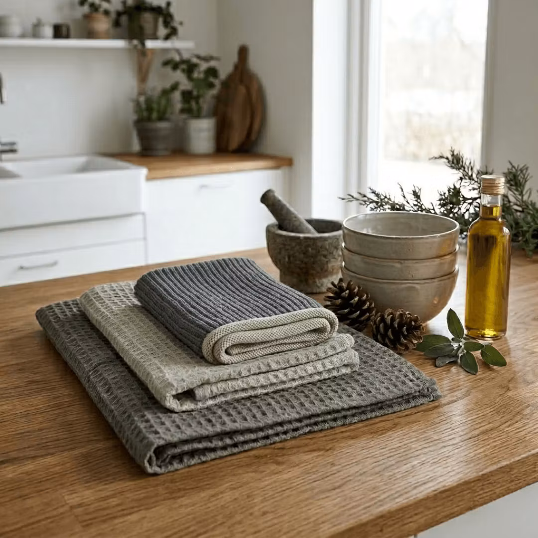 Setet består av en lyxig kökshandduk och två disk/städtrasor med struktur i gröna nyanser som ger köket en omedelbar uppgradering. Allt är tillverkat i 100 % ekologisk bomull och helt fritt från trista mikroplaster. Det är hållbart, det är snyggt och det är framför allt alldeles för läckert för att gömmas under vasken.