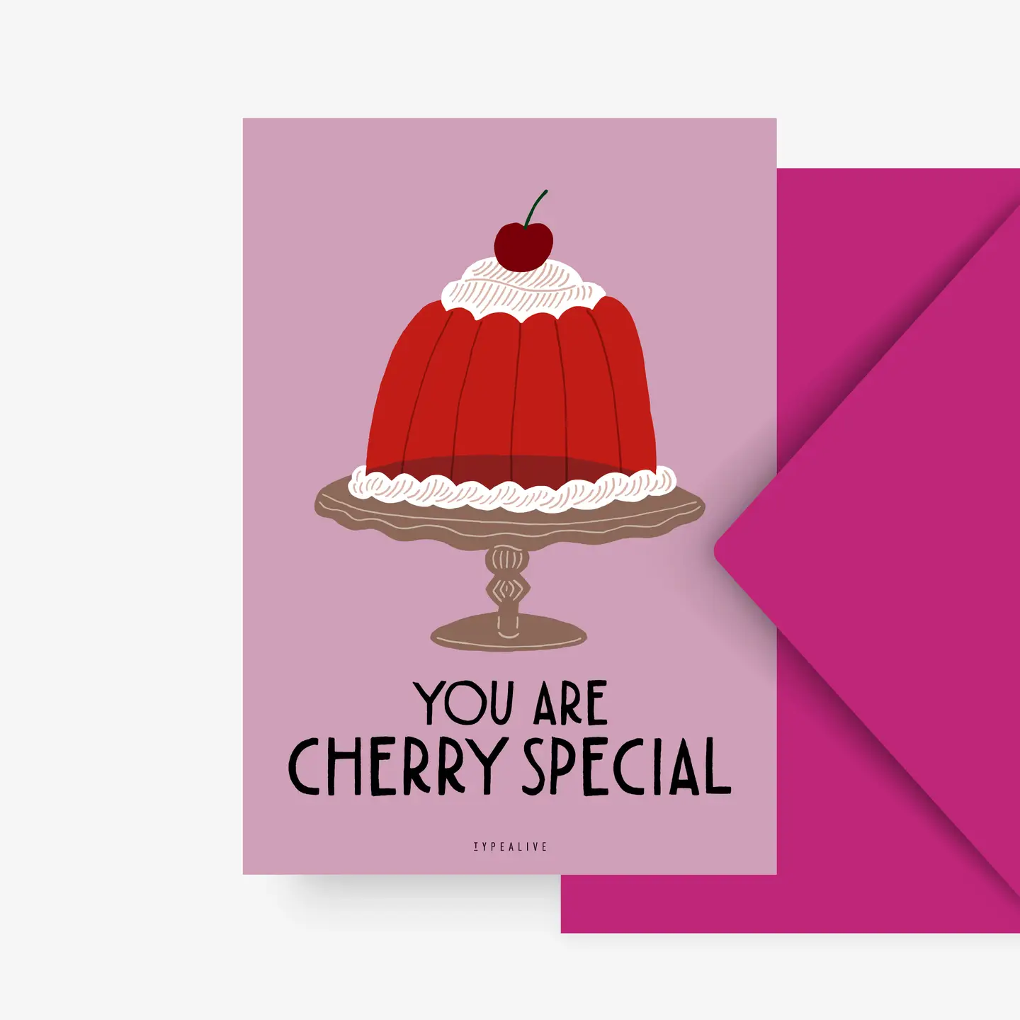 Rosa kort med ett motiv av en gele-efterrätt med körsbär och texten: You are cheery special. Inkl matchande cerise kuvert.