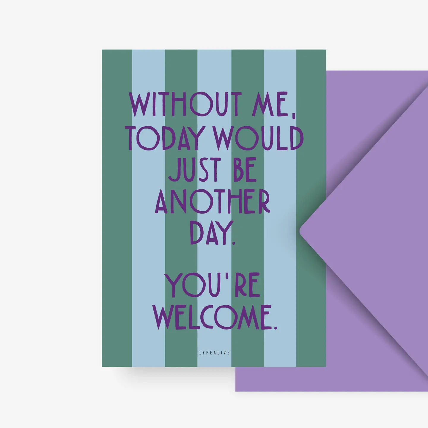 Grön/turkost kort med ränder och texten: Whitout me, today would just be another day. You´re welcome. Inkl matchande lila kuvert.