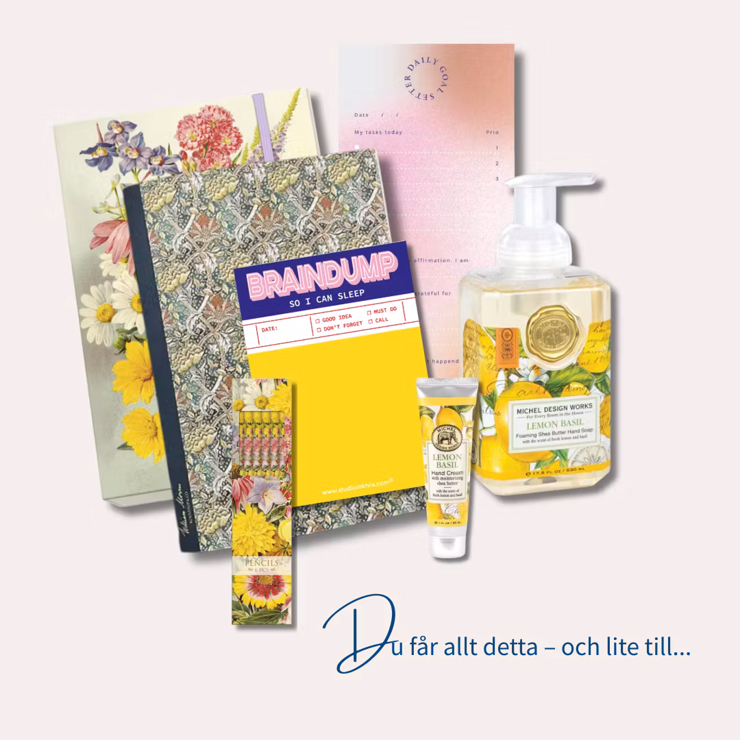 Varje paket är handplockat och sammansatt med omtanke – en mix av stil, kreativitet och vardagslyx. Du får alltid minst det du ser på bilden, och vi lägger alltid till lite extra detaljer som gör paketet ännu härligare.