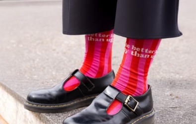 En handtvål i blommigt mönster står bredvid en poster med en kaxig replik.
